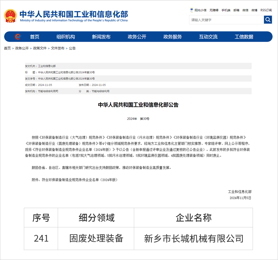近日,中華人民共和國工業(yè)和信息化部發(fā)布符合環(huán)保裝備制造業(yè)規(guī)范條件企業(yè)名單(2024年版)。其中,固廢處理裝備類企業(yè),新增11家,復(fù)核通過47家。新鄉(xiāng)市長城機(jī)械有限公司憑借固廢處理領(lǐng)域的創(chuàng)新技術(shù)和卓越表現(xiàn),繼2021年入選環(huán)保裝備制造業(yè)規(guī)范條件企業(yè)名單后,今年度再次順利通過復(fù)核。