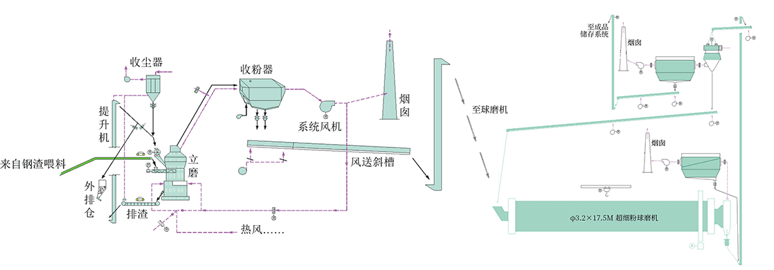 來(lái)自立磨系統(tǒng)的鋼渣粉,由提升機(jī)輸送至超細(xì)球磨機(jī)內(nèi)進(jìn)行粉磨,超細(xì)球磨機(jī)出口處配有收塵器對(duì)揚(yáng)塵處收塵;粉磨后物料由提升機(jī)送至選粉機(jī)進(jìn)行選粉,比表面積≥ 650 ㎡ /kg 的成品超細(xì)粉由收粉器進(jìn)行收集后通過(guò)空氣斜槽送至成品提升機(jī)入庫(kù);不合格細(xì)粉從選粉機(jī)底部出口經(jīng)過(guò)空氣斜槽返回超細(xì)球磨機(jī)入口,重新進(jìn)入球磨機(jī)內(nèi)粉磨,直至粉磨成為合格超細(xì)粉。