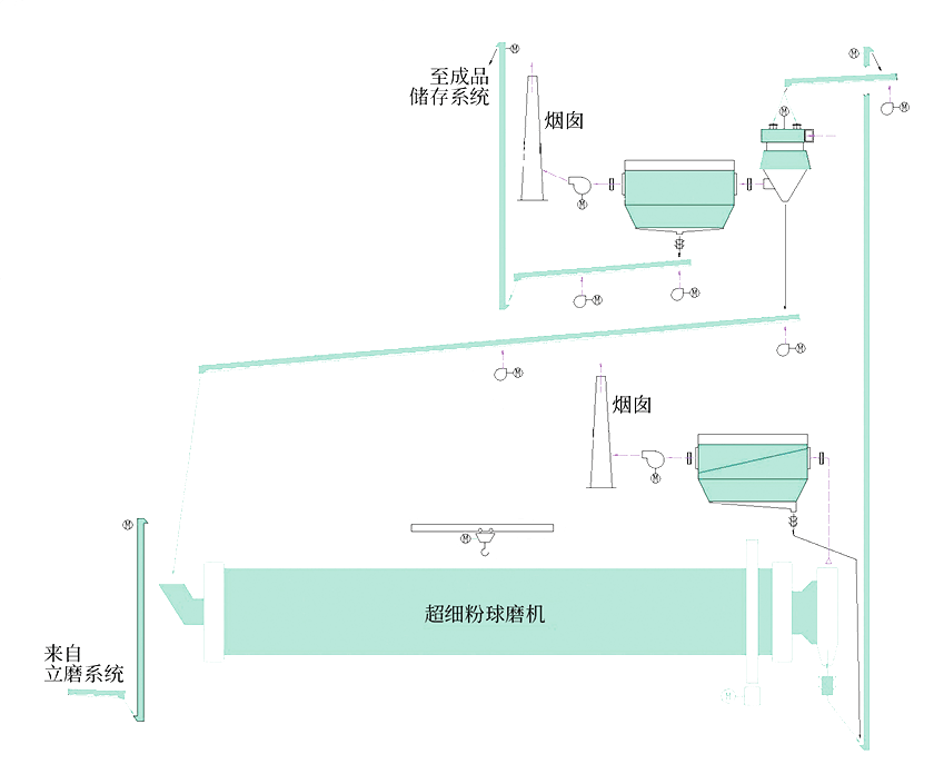 01來自立磨系統(tǒng)的物料粉,由提升機輸送至超細球磨機內(nèi)進行粉磨,超細球磨機出口處配有收塵器對揚塵處收塵;