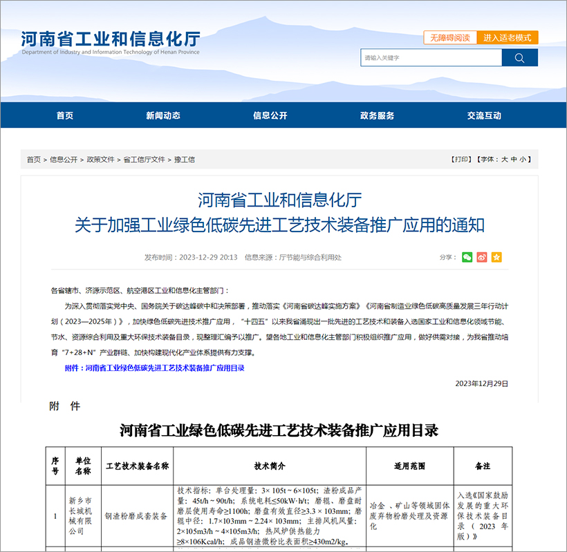 新鄉(xiāng)長(zhǎng)城鋼渣粉磨成套裝備入選河南省首次發(fā)布的《工業(yè)綠色低碳先進(jìn)工藝技術(shù)裝備推廣應(yīng)用目錄》